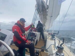 The sky is still grey and the wind is still blowing , after a quiet night without the squeaking noise that disturbed all of us the previous night (not due to a fender but due to a rope) it’s time to take the sea. I sent a video message to my friends showing the nice weather condition we were going to face and received a prompt reply from somebody in the Mediterranean commenting the grey sky against the blue one he was under. It’s a matter of point of view!