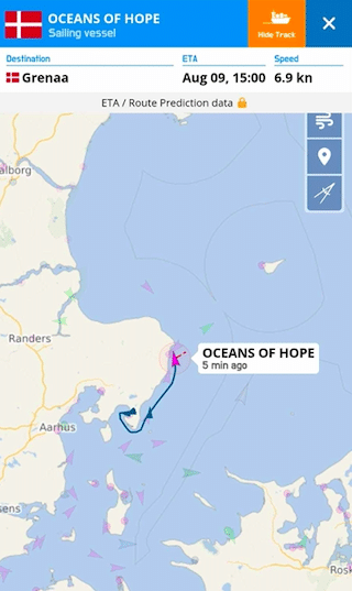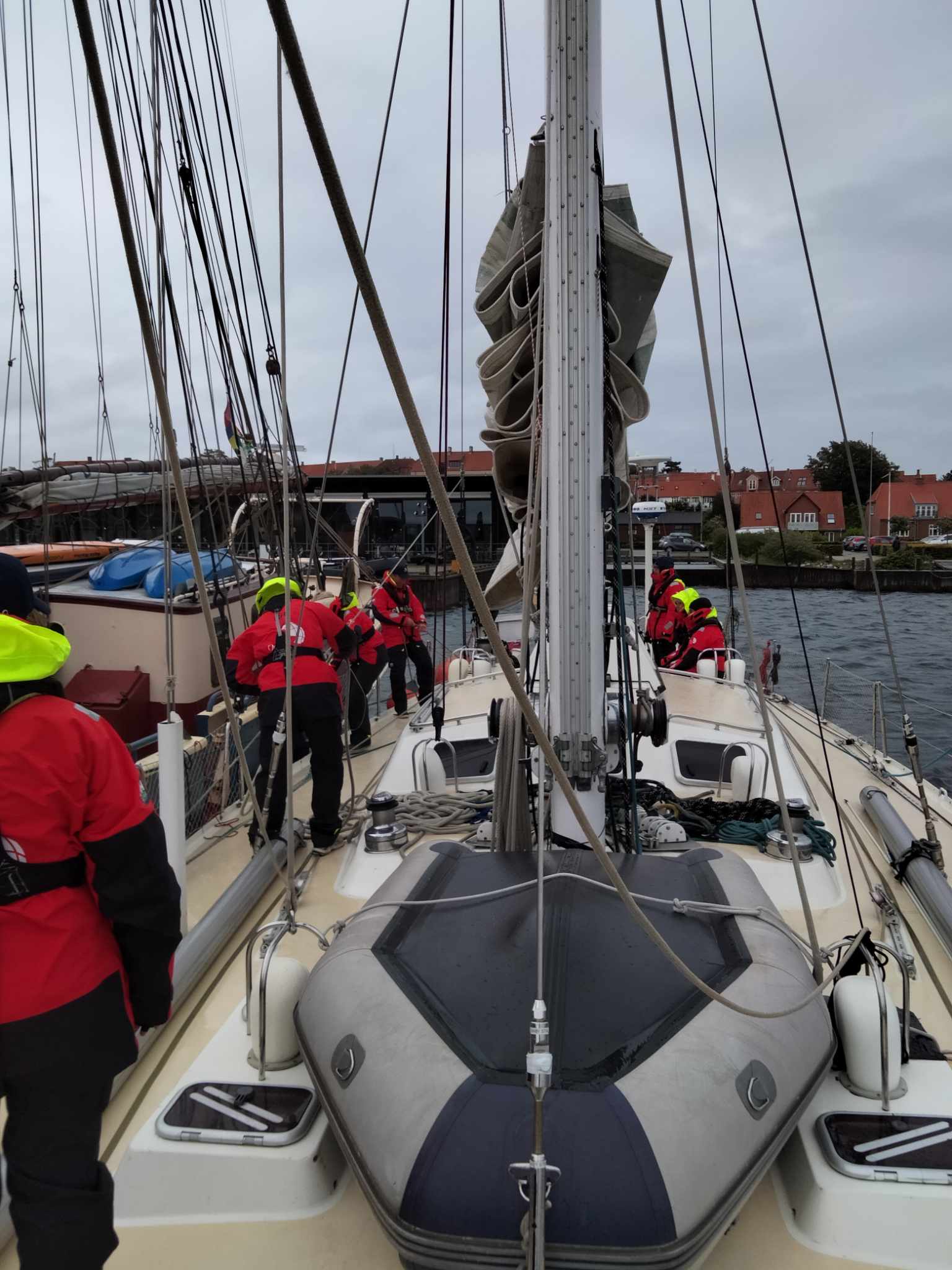11:30 we set sail with the help of the crew of the boat beside us in order to go against the wind and manouvring out of the port. Wind is fresh and waves not too high, after some time the engine is switched of and then we were properly sailing. We reached Grenaa and the team performed a perfect maneuvering: everybody ready and reactive on each own duty.