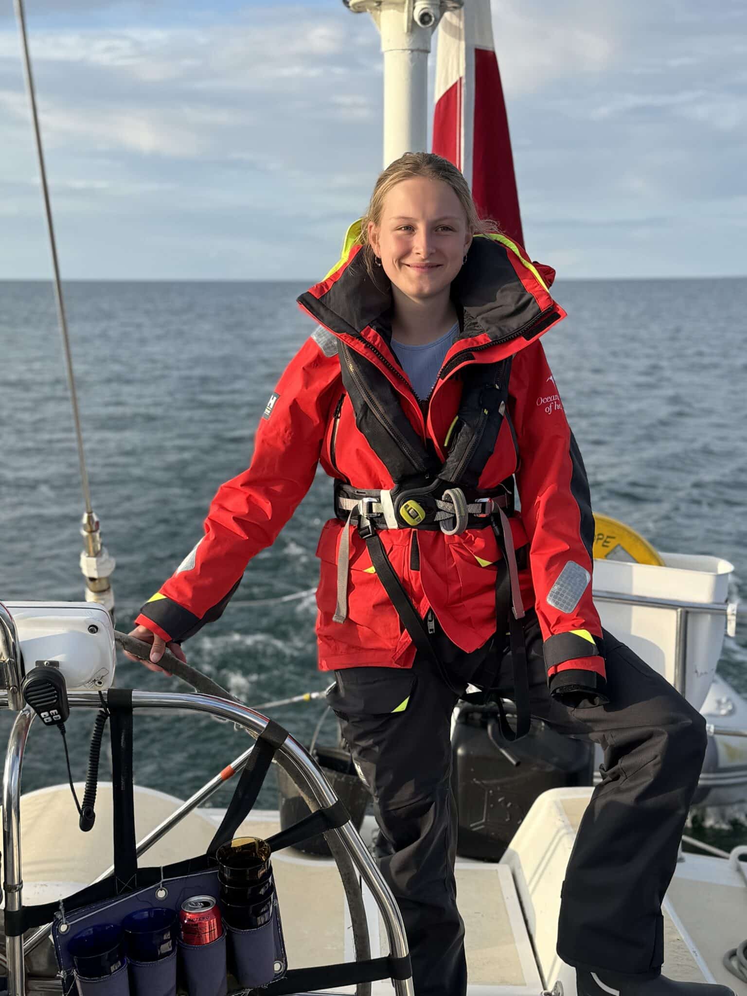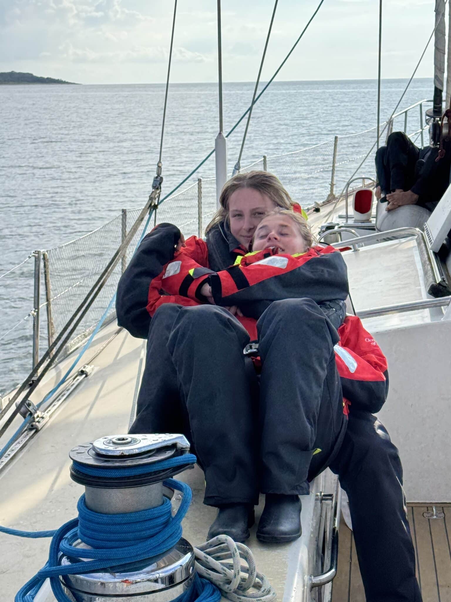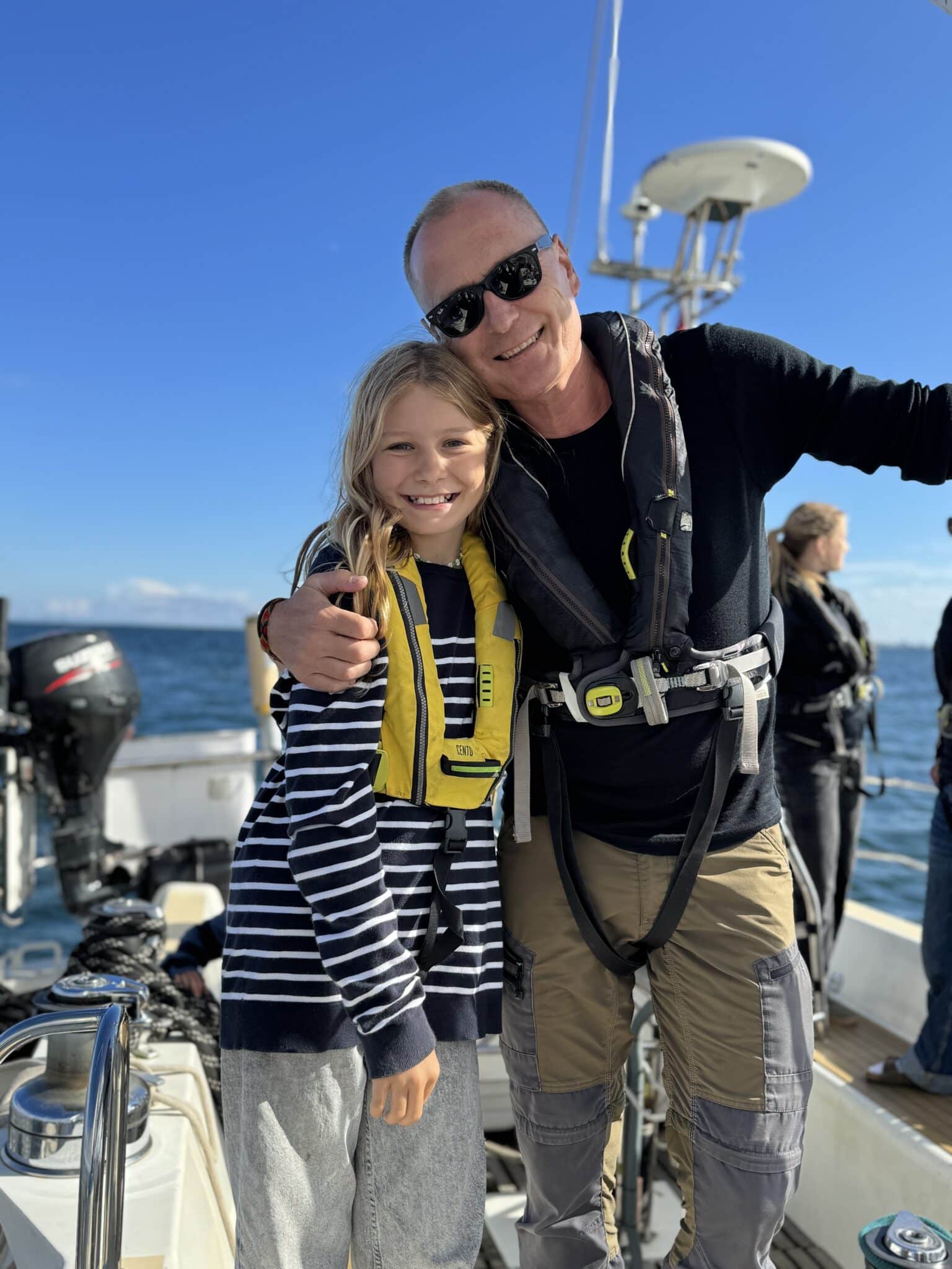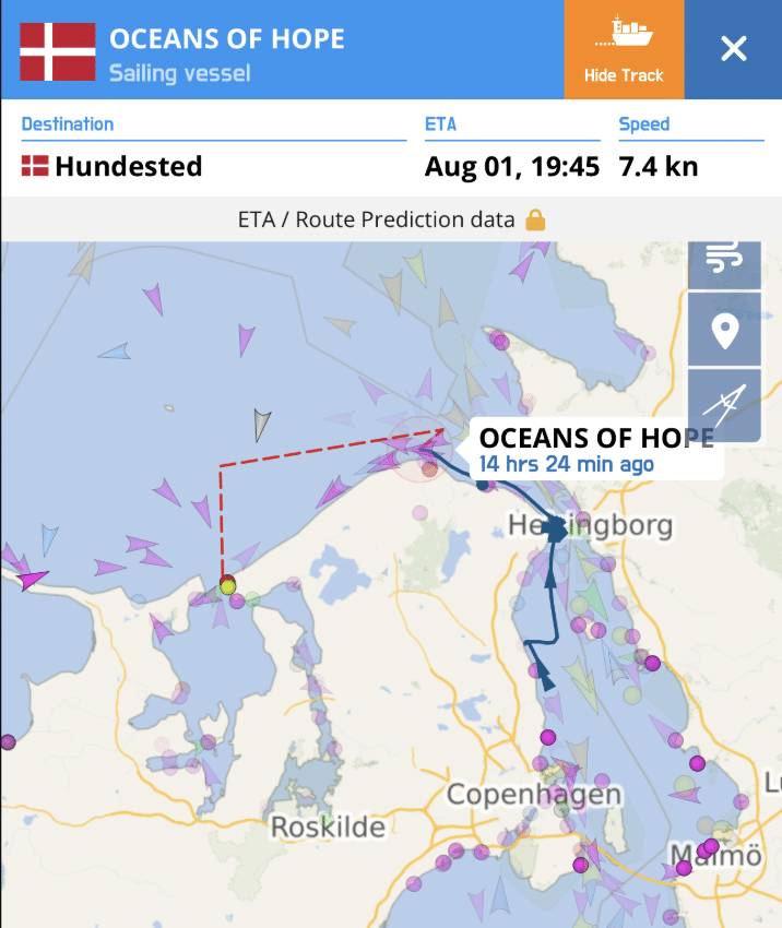 Fra solskinsfyldte Helsingør gik turen mod Hundested, men traditionen tro skulle vi naturligvis have et badestop. Denne gang ud for Hornbæk. Alle undtaget en var i vandet fra båden, mens vi i det fjerne kunne høre torden og næppe var vi kommet op, før vejret skiftede og vi måtte i vores dejligt varme sejlertøj. Ankeret blev hejst og vi sejlede videre mod Hundested. Igen med indlagte gode oplevelser – først så vi marsvin og siden sejlede vi tæt på Liseleje, så vores ene unge matros kunne vinke til familien inde på stranden.