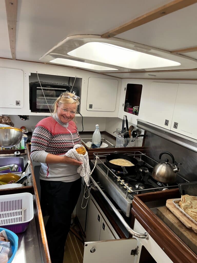 Vi sejlede afsted fra Güllholmen i regnvejr. Under sejladsen fik vi god frokost også i regnvejr, men så kom solen og Tine bagte pandekager.