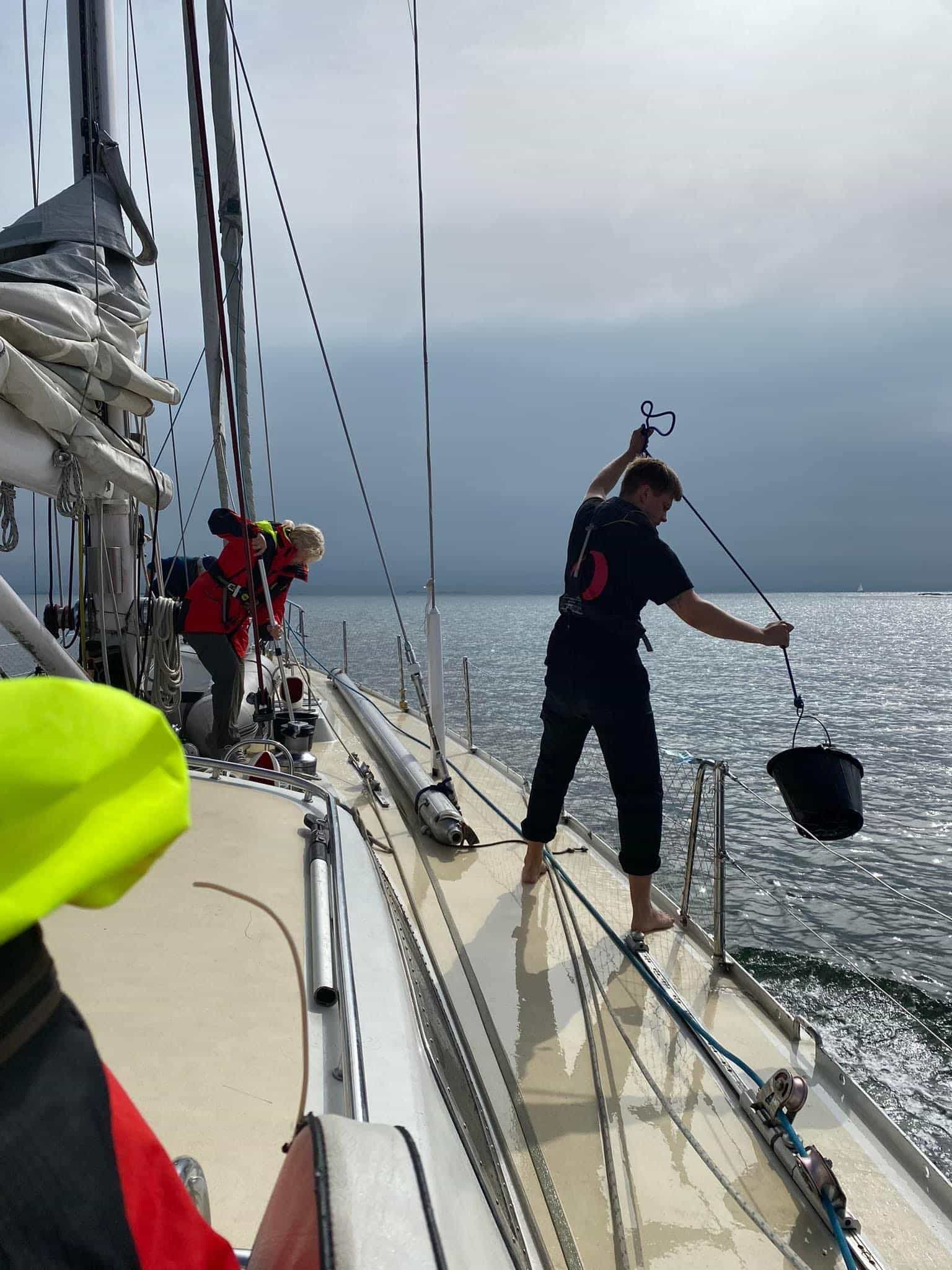 Efter frokosten var vi klar til at tænde motoren og gøre klar til havnemanøvre. Men da forholdene i havnen ikke var som forventet, og vi alle finter og fortøjninger var klargjort i bagbord side, så gjorde forholdene at vi hurtigt måtte flytte alt til styrbordsiden i stedet. Her viste holdet på bedste vis hvordan samarbejdet har udviklet sig gennem ugens forløb, ved hurtigt at få opgave klaret i fælleskab.