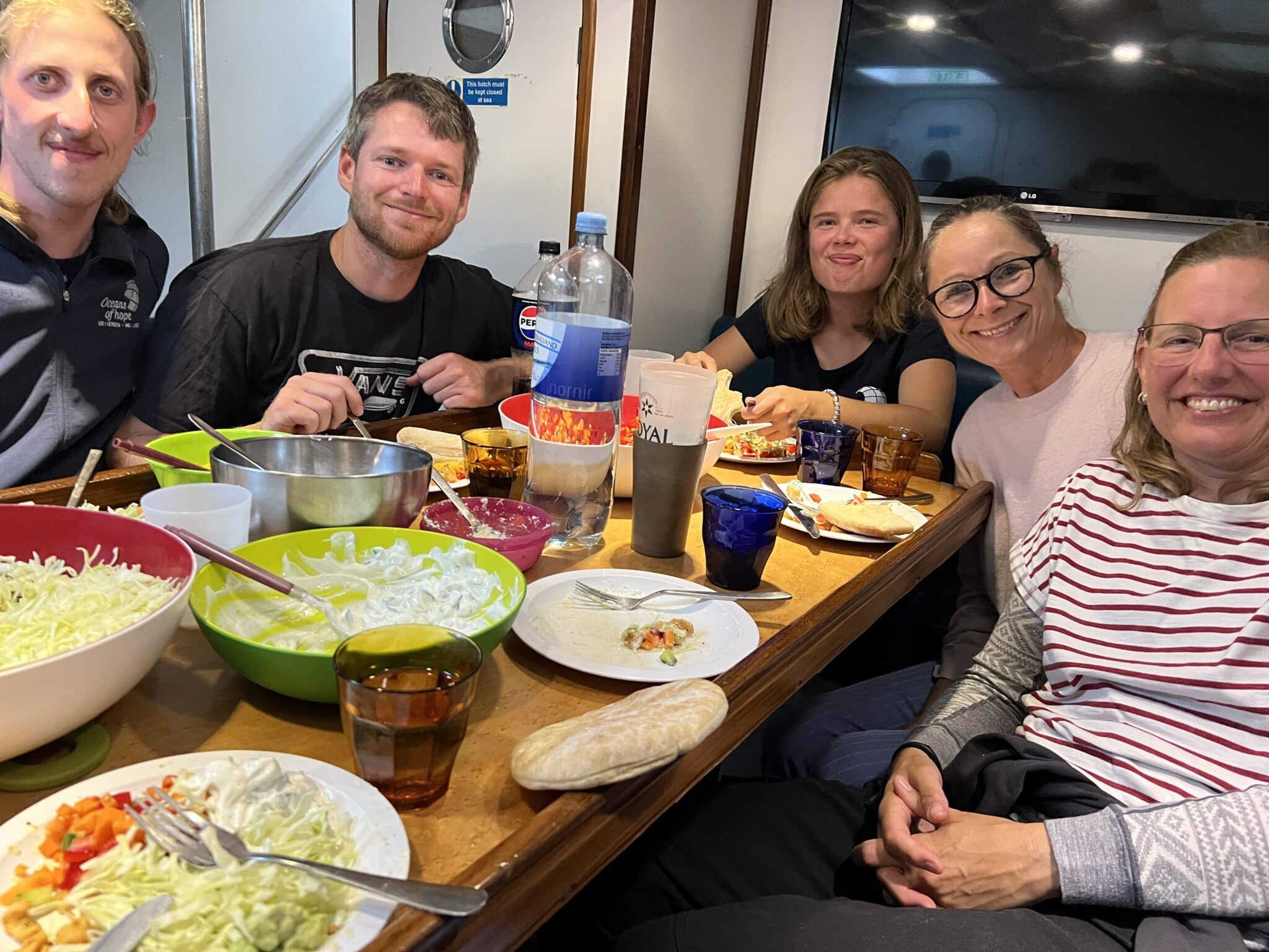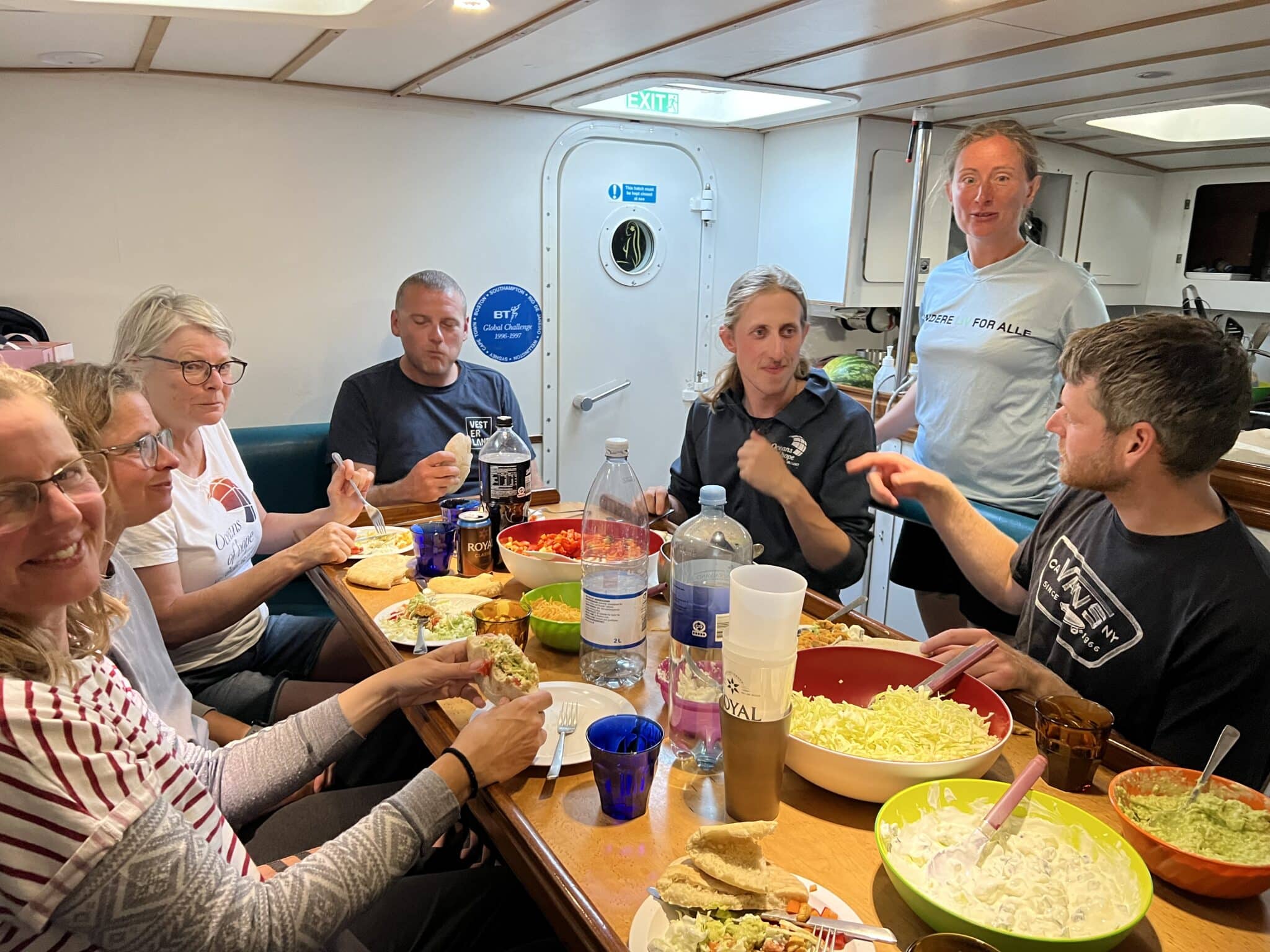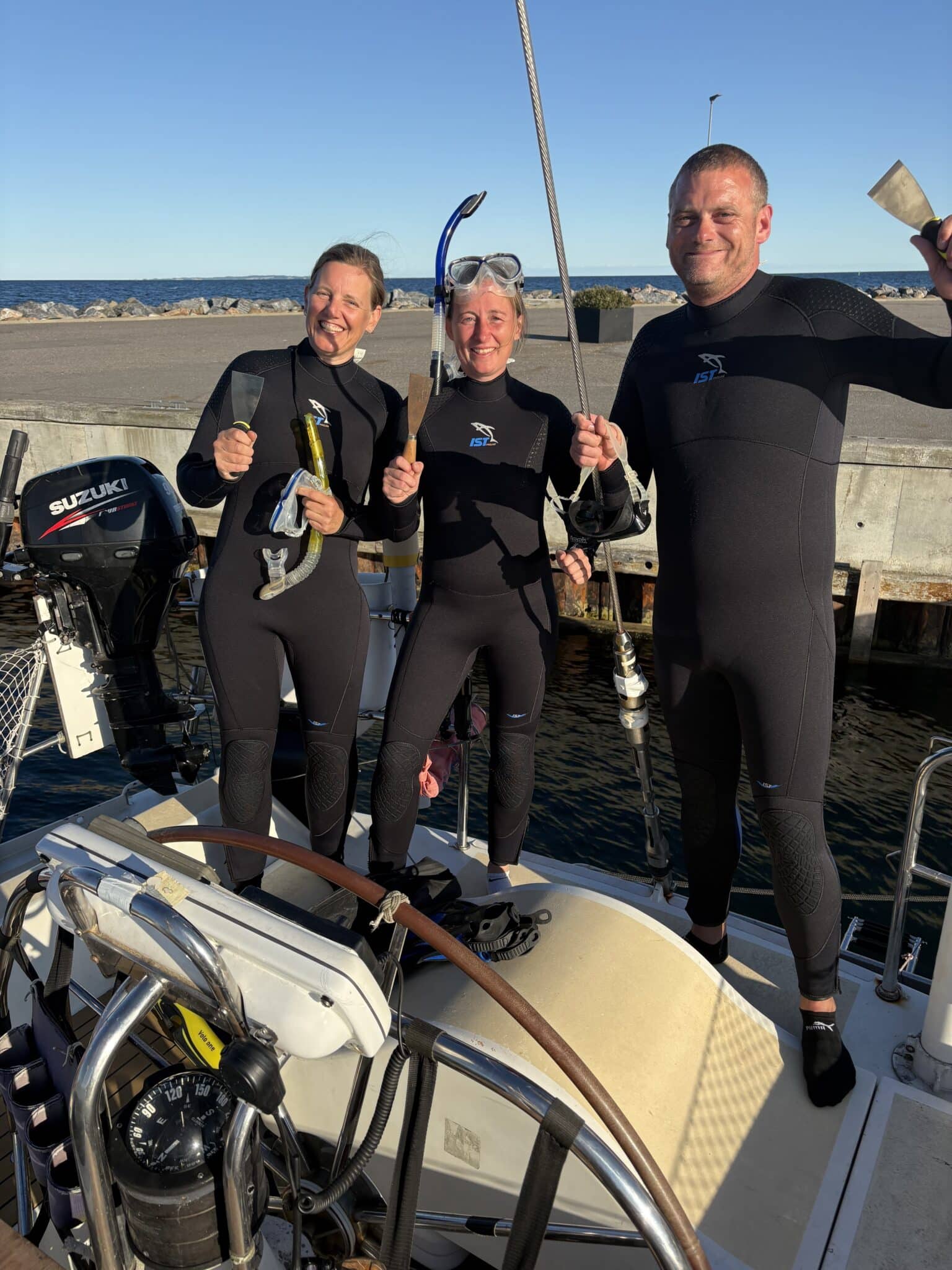 Så var der ellers fri leg, så nogle tjekkede Røde Kors butikken ud, tre friske frømænd hoppede i våddragter og tog en tjans med at skrabe alger og ruer af båden, mens køkkenholdet lavede lækre tarteletter til en rigtig hyggelig aftenpicnic på havnen afsluttende med lagkage-fejring af diverse årsdage.