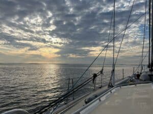 Udsejlingen var meget smuk med solopgang og enkelte krusninger på vandet. Vejret var intet mindre end fantastisk, hvorfor flere valgte at spiste morgenmad i solen på dækket.