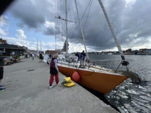Klokken er nu 21.40. Da vi anløb Sønderborg, var der reserveret en plads til os på promenaden med udsigt til Sønderborg slot og med masser af nysgerrige mennesker, der synes vi var meget spændende. Vi fandt sandwichskiltet frem fra depotrummet og fik sat det op på kajen, så vi kunne gøre lidt reklame for os selv. Enkelte spurgte ind til projektet og en enkelt (med MS) havde læst om det på nettet og havde set, at vi kom til Sønderborg. Så hun fik en rundvisning og er klar på at tilmelde sig næste sommertogt.
