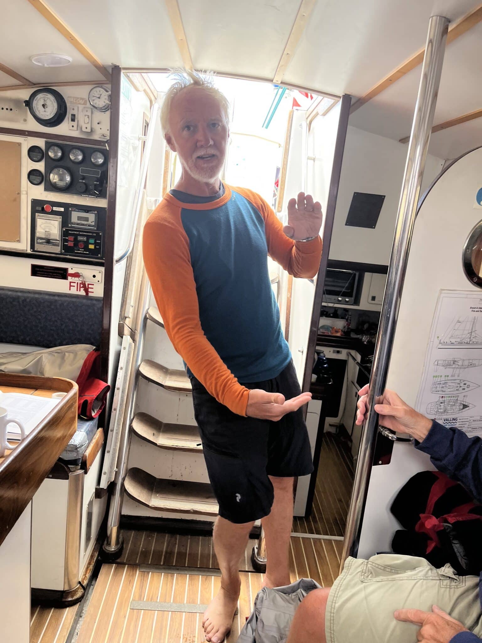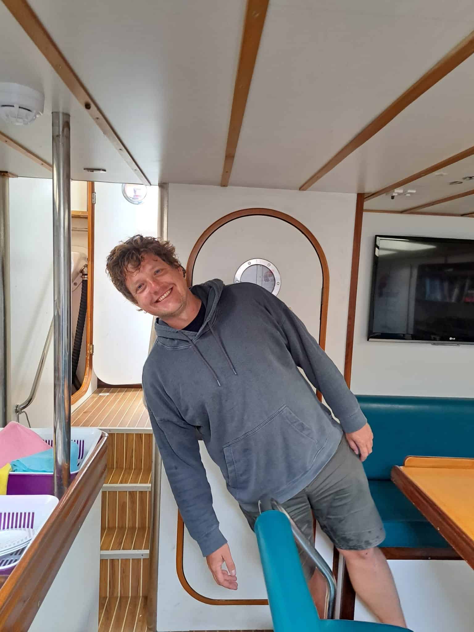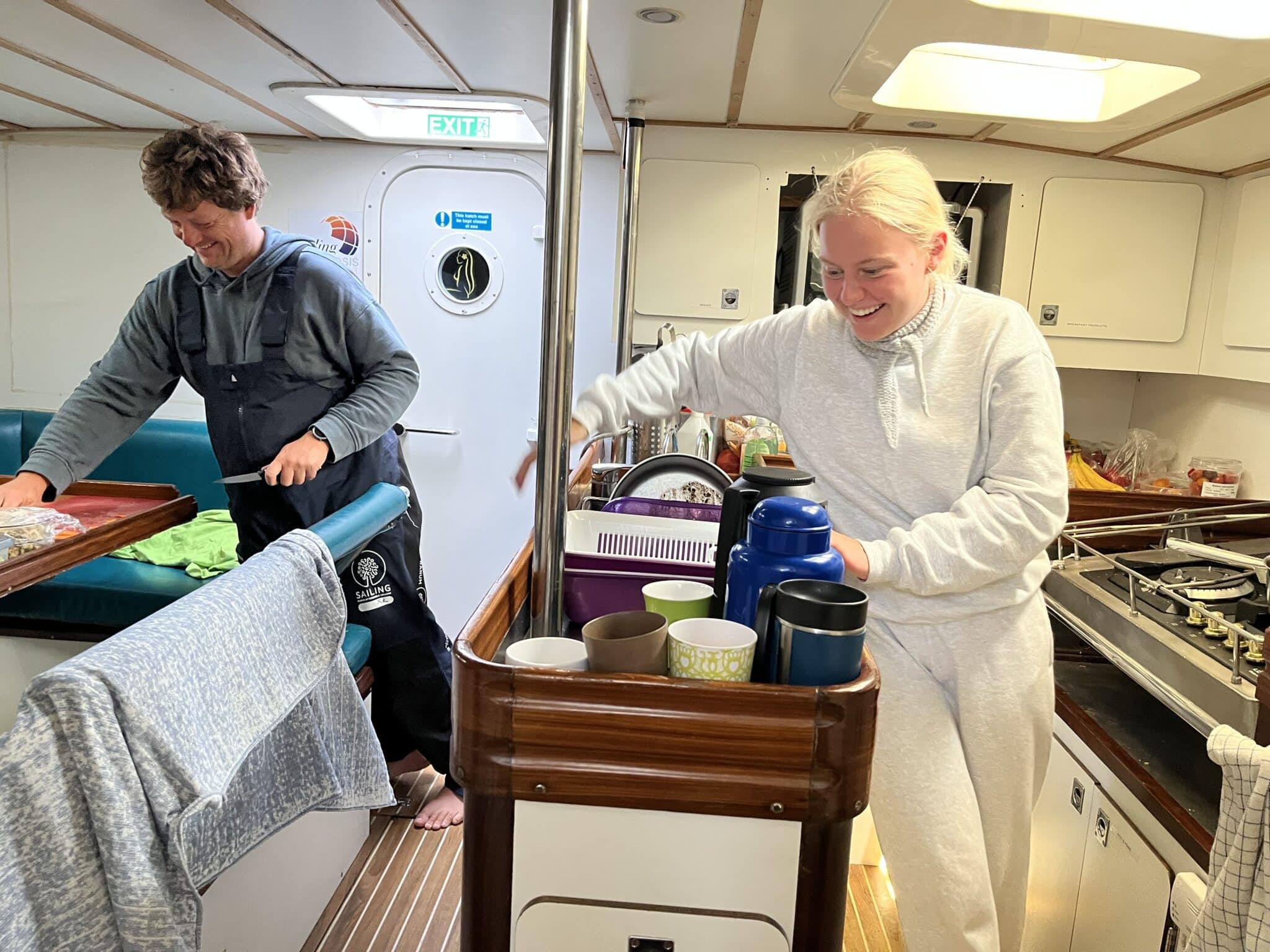 Efter en sen nat for nogle, blev det lidt senere før folk fik øjne. Nogle havde haft en dejlig nat trods motorlarm helt hen til kl. 01.30, hvor ankeret blev smidt – andre havde haft en våd nat…selv i deres seng…for det viser sig, at nogle af vinduerne ikke holder helt lige så tæt som andre… så Mia forskød til bænken i kabyssen, da hun ikke kunne holde soveposen tør. Oven i det er vandpumpen til brugsvandet begyndt at lække, så Jannes gulvvaske tjans blev så nem, at hun faktisk ikke rigtig vidste hvor hun skulle starte…😂